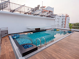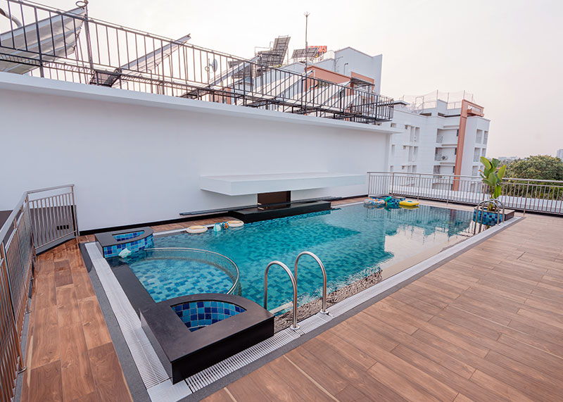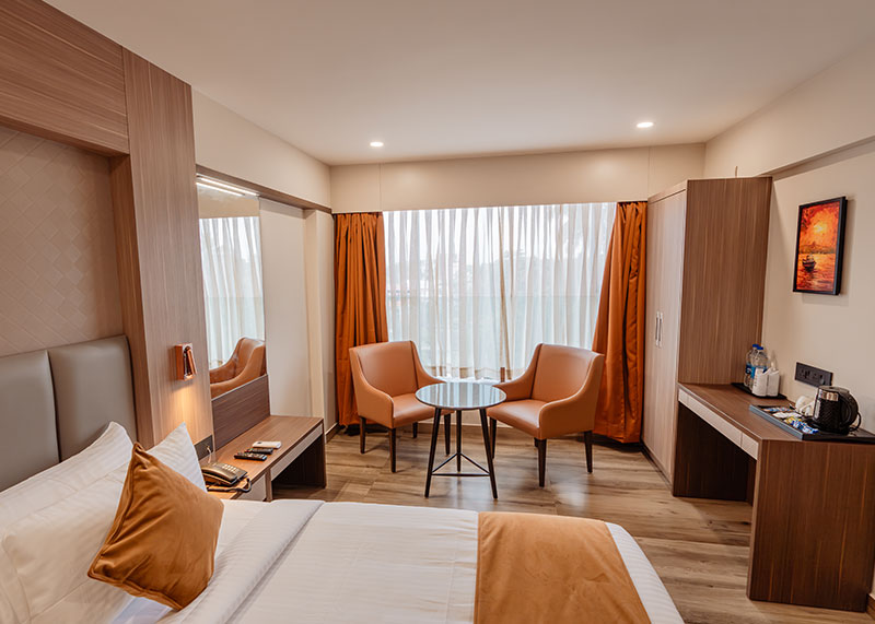 Unwind in style in our 49 Deluxe Rooms, each spanning 200 sq. Ft. And offering a serene retreat with a well-lit ambience. Choose from a variety of bed configurations and enjoy a wealth of premium amenities, including seamless WiFi, in-room services, 300 TC thread count bed sheets, 43” 4K Smart LED TV, electronic safe, tea/coffee maker, soundless air-conditioning, rain shower, Iron board & iron box, Hair dryer and complimentary toiletries. Take in the vibrant views of the bustling town through floor-to-ceiling glass windows and enjoy additional privileges like laundry services, drinking water, and complimentary access to our pool and gym.