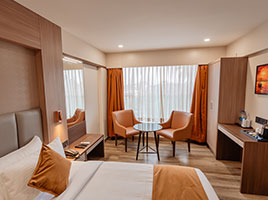 Ideal for solo travellers, tour agents, and tour managers, our 3 single rooms offer a cosy retreat, spanning 163 sq. Ft. Each. Featuring double bed configurations, these rooms are equipped with a range of premium amenities, including seamless WiFi, in-room services, 300 TC thread count bed sheets, 43” 4K smart LED TV, electronic safe, tea/coffee maker, soundless air-conditioning, rain shower, Iron board & iron box, Hair dryer and complimentary toiletries. Additional privileges include floor-to-ceiling glass windows, laundry services, drinking water, and complimentary access to our pool and gym, ensuring a comfortable and relaxing stay.